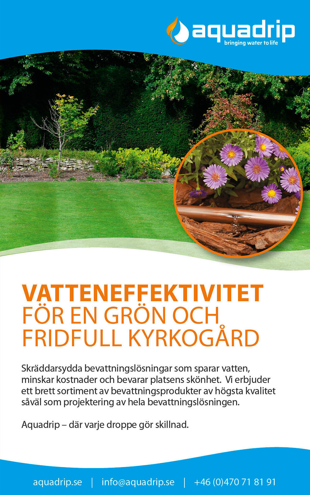 Förbättra din kyrkogård med effektiv och hållbar bevattning, skräddarsydd efter dina behov. Vi uppgraderar befintliga system eller installerar nya med modern teknik för att minimera vattenförbrukningen. Automation, regnsensorer, droppslangar och effektiva sprinklers gör att varje droppe räknas. Spara vatten, sänk kostnaderna och maximera resultaten med Aquadrip.