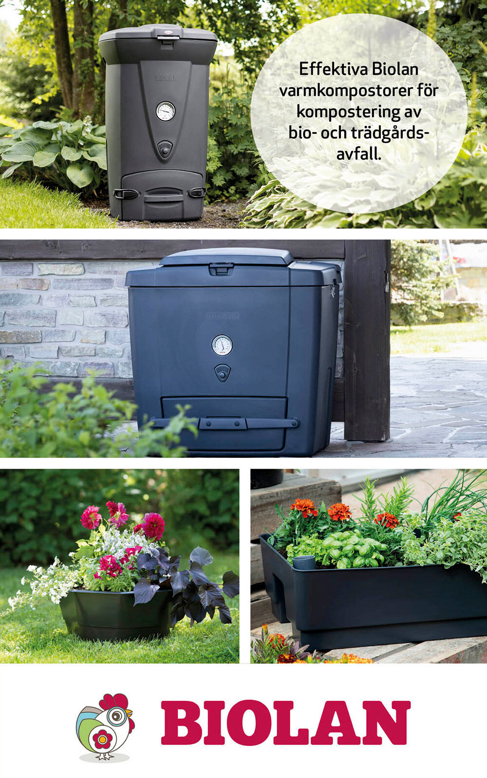 Biolans varmkompostorer fungerar året runt och är hygieniska samt enkla att använda. Genom att kompostera bioavfall på plats återförs organiskt och nedbrytbart avfall till naturens kretslopp. Samtidigt minskar behovet av transporter och avfallshantering, vilket bidrar till lägre samhällskostnader.