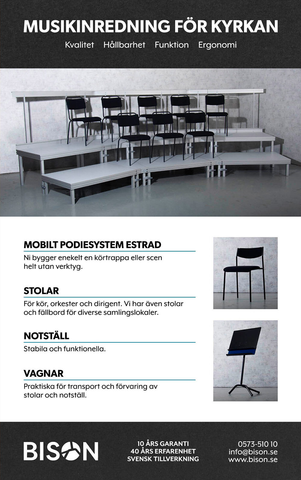 BISON har i 40 år tillverkat och tillhandahållit mobila körtrappor, musikerstolar, notställ och mobila scener. Med vår 10års garanti på produkterna har vi en långsiktig relation till våra kunder och vi arbetar med hållbarhet i alla led från produktion till leverans. Våra produkter är lättanvända och smidiga att montera och justera. Vi har alltid ett personligt bemötande och många av våra kunder är kyrkor världen över. Vi skräddarsyr lösningar så att det passar just era behov.