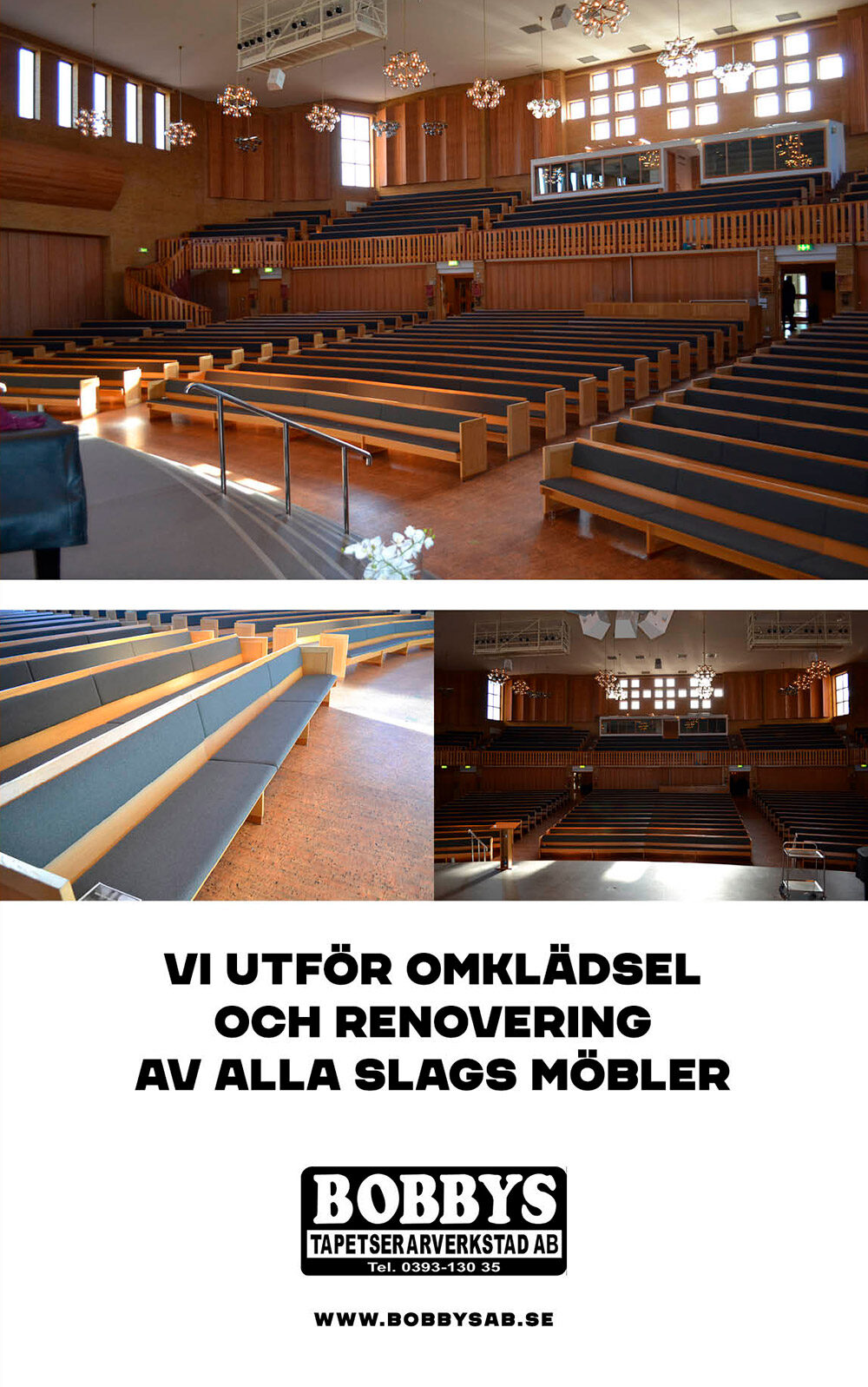 Bobbys Tapetserarverkstad AB har lång och god erfarenhet av såväl renovering som nyproduktion av alla typer av klädda möbler, dynor för kyrkor och offentlig miljö.