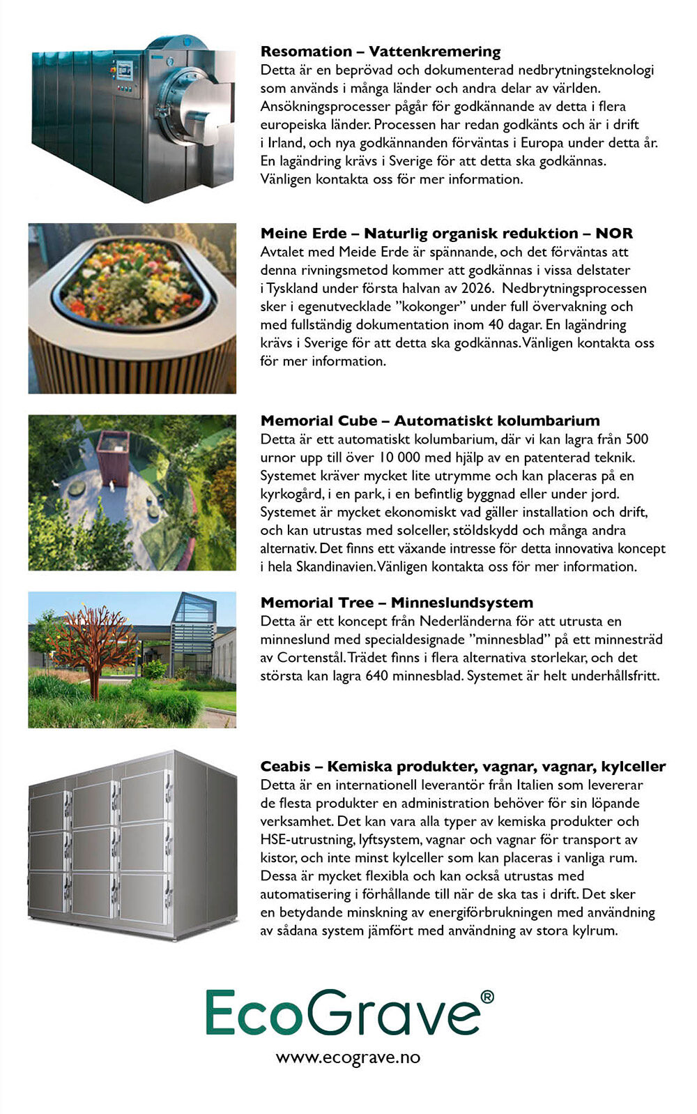 Ecograve AB är ett nyetablerat dotterbolag som verkar på den svenska marknaden. Företaget erbjuder ny teknik såsom vattenkremering (alkalisk hydrolys) från Resomation, naturlig organisk reduktion (NOR) från Meine Erde, automatiska kolumbarier från Memorial Cube, system för minneslundar från Memorial Tree samt produkter och system från Ceabis och andra teknikpartners från både Europa och andra delar av världen. Fråga oss vad vi kan erbjuda för din kyrkogård eller ditt krematorium. Vi har en lösning.
