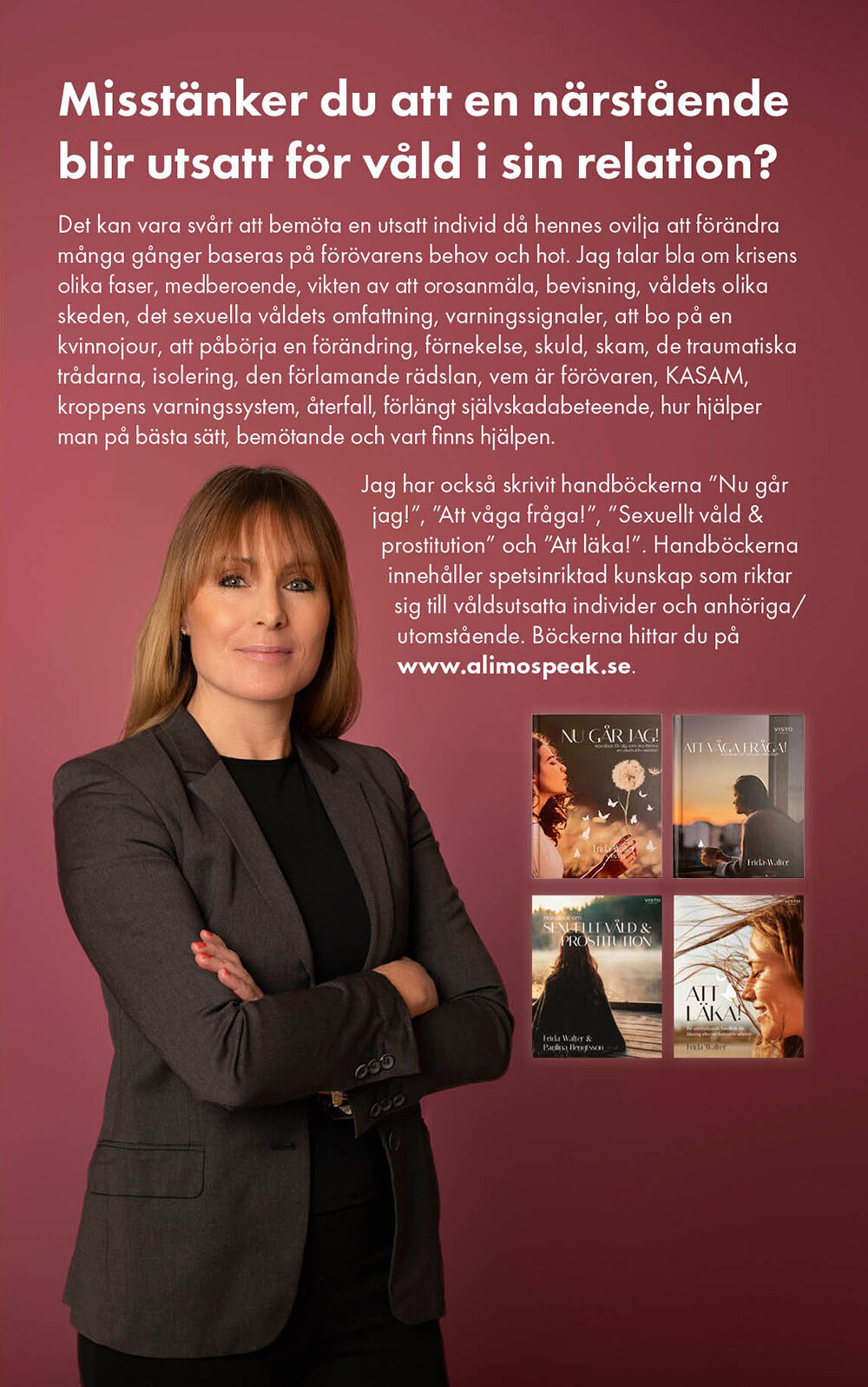 Föreläsningen bär titeln ”Varför går hon inte?” vilket inte bara är en titel utan också en fråga som många i samhället ställer. Våld i nära relationer är ett tabubelagt ämne som är komplex, genom spetsinriktad kunskap och samverkan möjliggör vi för en livsviktig förändring. Jag är utbildad jourkvinna med mångårig erfarenhet av att möta våldsutsatta kvinnor och barn på skyddade boenden, jag är också utbildad forensisk sköterska och arbetar på Akut-mottagningen för våldtagna. Jag arbetar även som författare och har skrivit flertal handböcker inom ämnet. Föreläsningen anpassas efter målgrupp och behov, tillsammans skapar vi ett upplägg som passar just er verksamhet bäst.