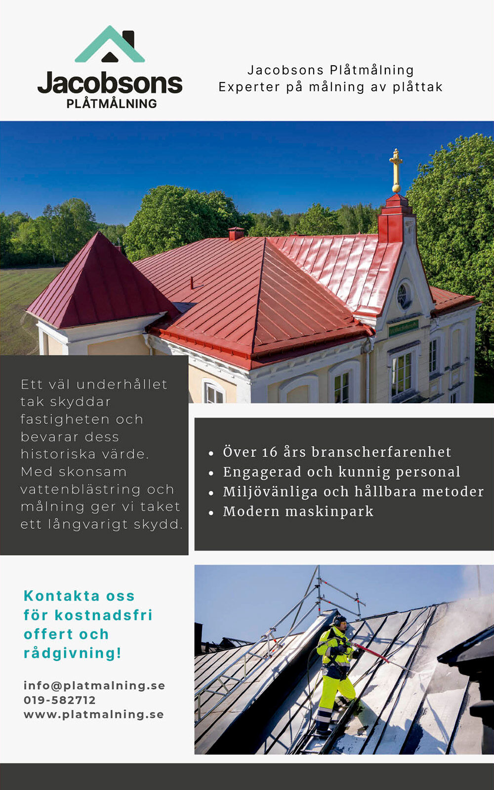 Jacobsons plåtmålning grundades 2008 och är idag är ett av Sveriges största företag inom målning av plåttak. Genom mångårig erfarenhet, en modern maskinpark, i kombination med ett samlat kunnande, värnar Jacobsons Plåtmålning om det traditionella hantverket. Vi är självklart med i Plåtslagarnas Riksförbund. Våra uppdragsgivare är fastighetsägare, kommuner samt privatpersoner.