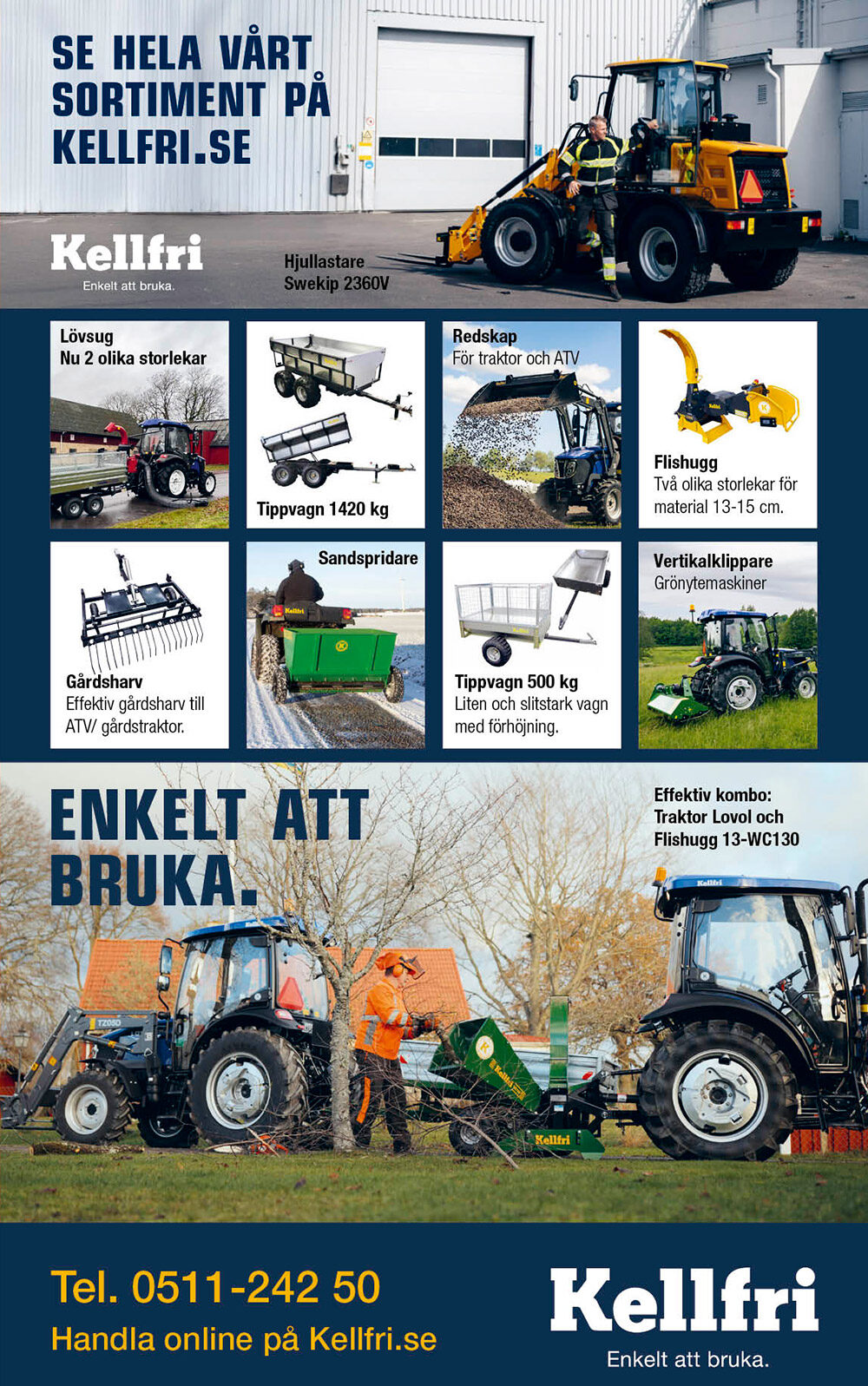 Förbered för våren med kellfris ATV-ekipage, kantskärare, räfsor och andra trädgårds-redskap. En liten tippvagn med förhöjningslämmar är ett praktiskt tillbehör för att frakta trädgårdsavfall och avklippta grenar. Sommarens grönytor är vår specialitet med ett brett utbud av maskiner för både traktorer och ATV. Kundfavoriten för ATV är vår slaghack med lucka och dubbeldrag.