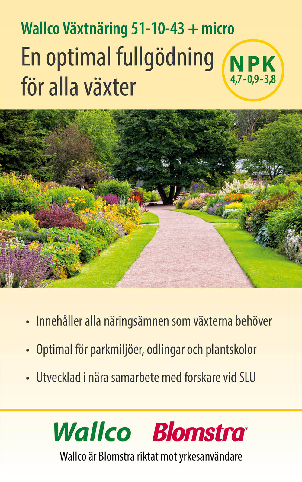 Wallco innehåller alla essentiella växtnäringsämnen i optimala proportioner, baserat på prisbelönt forskning vid SLU. Produkten främjar tillväxt och kvalitet för prydnadsväxter och stärker trädgårdsväxters motståndskraft.