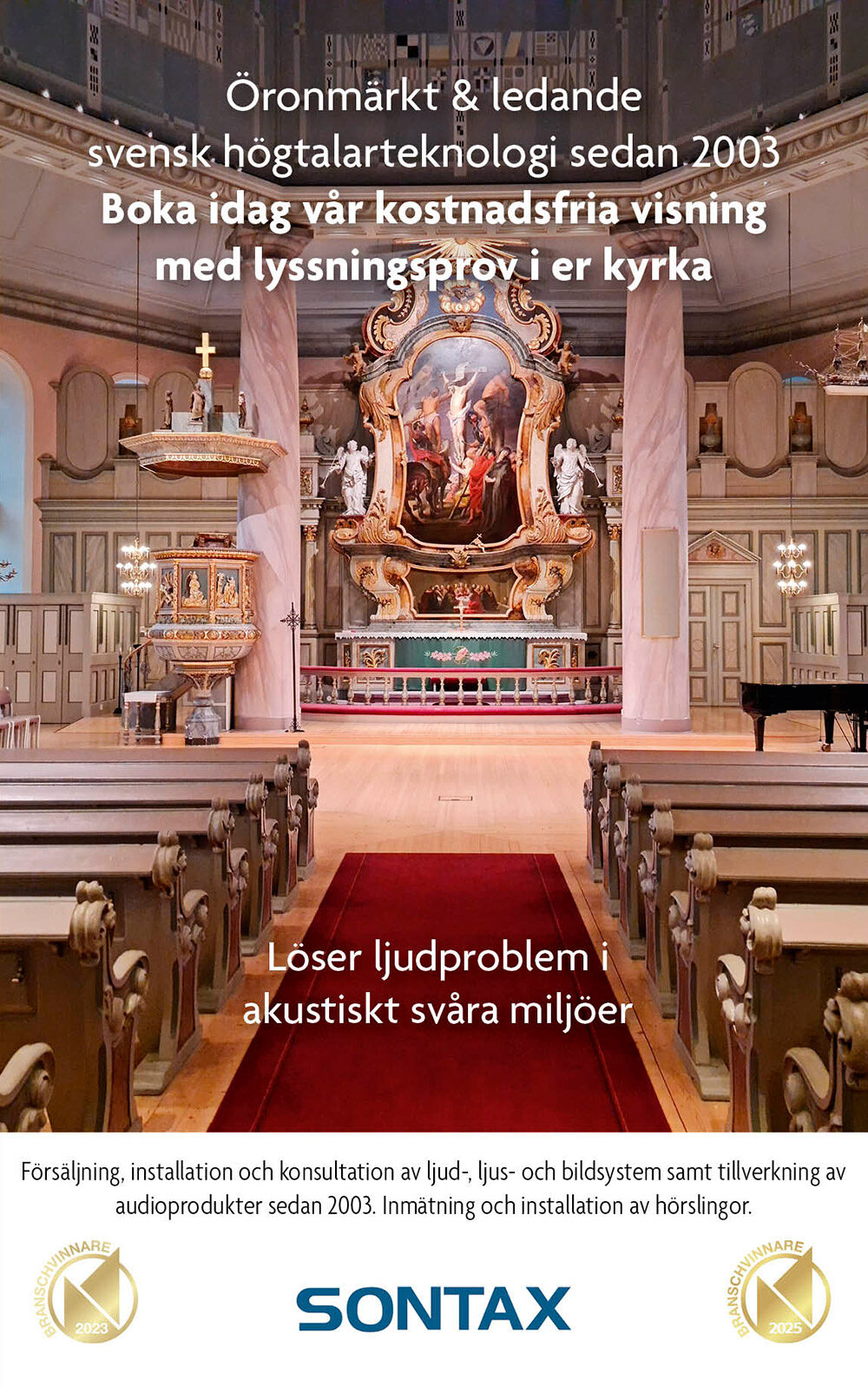 Sontax har sedan bolagets start 2003 blivit synonymt med god hörbarhet i svåra akustiska miljöer. Företaget är unikt på svensk marknad tack vare utveckling och tillverkning av Sontax patenterade True Line Source högtalarteknologi. Denna ger användaren en fantastisk high end ljudkvalitet som överträffar övriga högtalarsystem på marknaden idag. Sontax Insider högtalarserie återfinns idag i hundratals kyrkor med många mycket nöjda användare.