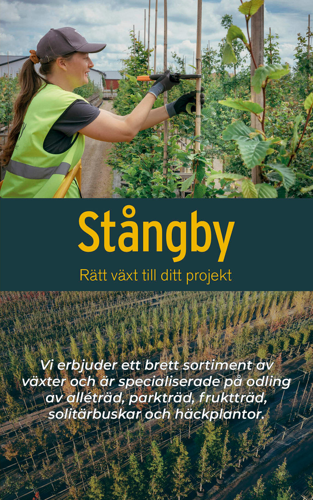 Vi är särskilt stolta över vårt varumärke Stångby Premium, som står för noggrant utvalda växter med stark vitalitet. De odlas i Air-Pot® som bidrar till ett välutvecklat rotsystem som ger snabb och säker etablering. Våra träd beskärs med omsorg och får välformade kronor med hög kvalitet.