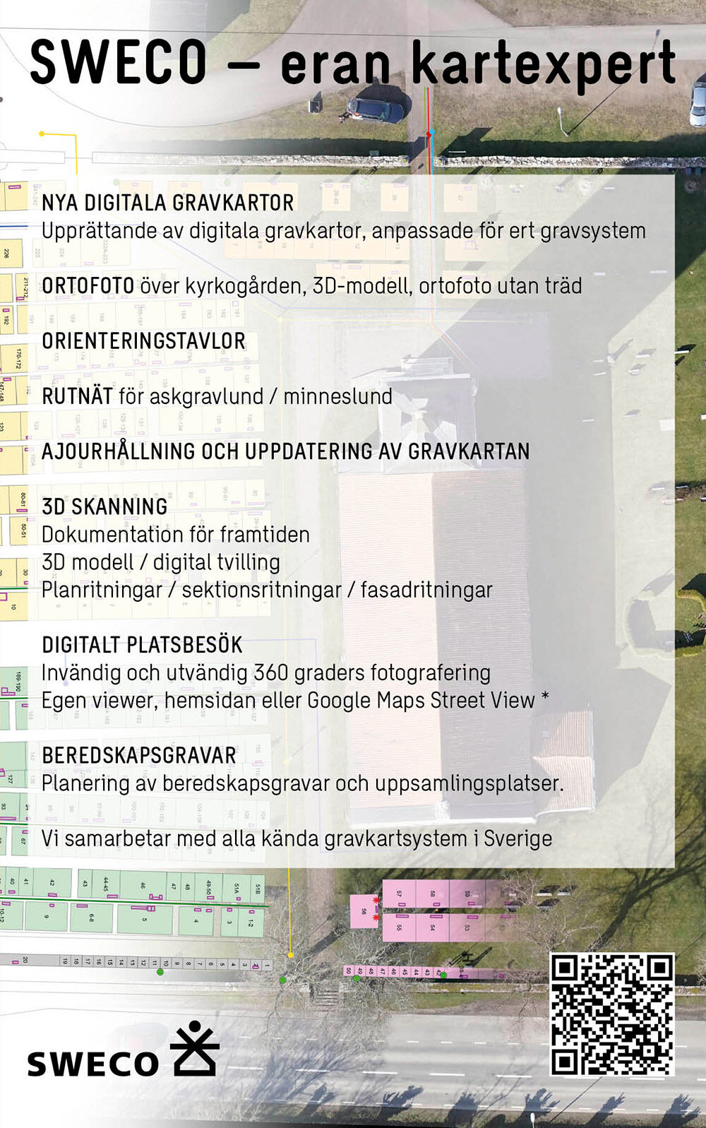 Sweco Mätningsteknik har specialiserat sig på att upprätta digitala gravkartor som är förberedda för koppling mot kundens gravregister. Vi erbjuder även andra typer av tjänster som 3D-laserskanning, 360 fotograferingar och flygfotograferingar med drönare.
