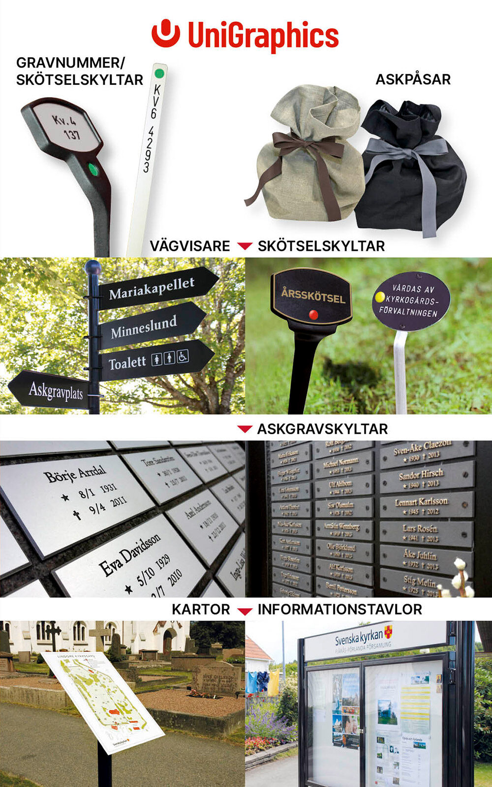 UniGraphics AB är en av Sveriges största leverantörer av skyltar till kyrkogårdar. Företaget startade 1934 och har lång erfarenhet av gravering och tillverkning av skyltar och andra grafiska produkter.