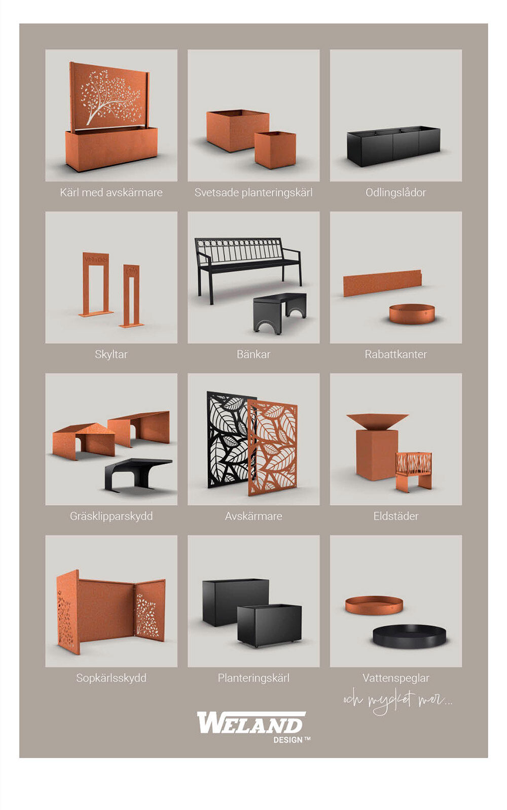 Weland Design™ är ett varumärke som tillverkar planteringskärl, avskärmare, kantstål, sopkärlsskydd, robothus, eldstäder, utemöbler m.m. Vi tillverkar även specialdesignade produkter som gravramar till gravstenar, minnesträd och värmepumpskydd där varje alster är unik. Vi har vår produktion i Småland och känslan för entreprenörskap, kreativitet och viljan att alltid finna lösningar bär vi med oss i allt vi gör.